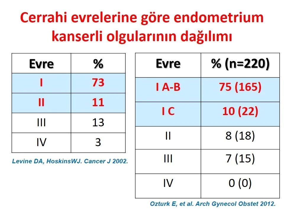 Endometrium kanserinde hastalığın yaygınlığına göre dört evre bulunmaktadır. Geç tanı konulmuş, evre 3-4 yani ileri evre hastalık, yaklaşık olarak yüzde 10-20 hastada saptanmaktadır ve bu olgularda beş yıllık sağ kalım oranı ciddi oranda düşmektedir. Erken evrede (Evre 1-2) tanı almış tedavisi eksiksiz yapılmış hastalarda beş yıllık sağ kalım oranı yüzde 75’in üzerindedir.